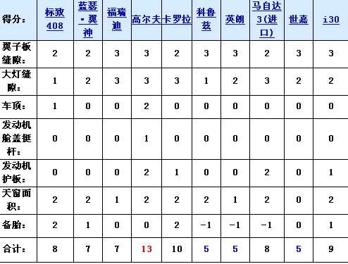 不難看出,標(biāo)致408雖然夠大,但他的做工和細(xì)節(jié)并不像看上去那么精細(xì),在10款緊湊型車中僅僅處于中等水平;藍(lán)瑟·翼神各方面中規(guī)中矩,沒有突出的亮點(diǎn);福瑞迪的外觀縫隙控制最出色,但天窗面積和備胎令人不爽;身材最小的高爾夫6因?yàn)榫哂芯?xì)的外部做工,大面積的天窗和發(fā)動(dòng)機(jī)護(hù)板而在外觀方面有一定的優(yōu)勢(shì),同時(shí)他的外觀也是十分招人待見的,只不過不停的減配令人很不爽;卡羅拉中庸但沒有明顯的短板,所以得分也不低;來自于通用集團(tuán)的科魯茲和英朗存在同樣的問題:大燈縫隙有點(diǎn)大,小備胎令人很很懊惱;進(jìn)口馬自達(dá)3如果不是因?yàn)樾涮サ脑,那么成績也不錯(cuò);世嘉除了縫隙控制得還可以以外,其他方面沒有任何亮點(diǎn);i30的表現(xiàn)卻比想象中強(qiáng)大,各方面均衡,成績僅次于卡羅拉。
