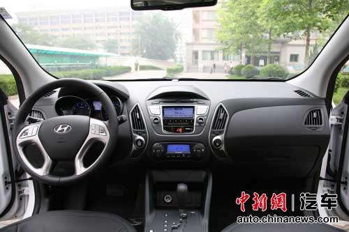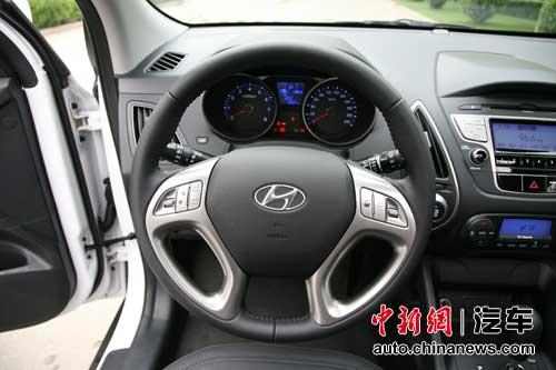 我們拿到的這輛ix35是2.0GLS尊貴版,采用全黑色內(nèi)飾,除此之外還有上黑下淺的另一種內(nèi)飾風(fēng)格。全黑色內(nèi)飾顯然更招年輕人待見(jiàn)。ix35的內(nèi)飾采用了對(duì)稱設(shè)計(jì),中控面板造型簡(jiǎn)練,中間的六邊形設(shè)計(jì)和四周的線條再次與車(chē)身風(fēng)格呼應(yīng)。內(nèi)飾黑底色上點(diǎn)綴的銀色恰到好處,只是幾乎整個(gè)內(nèi)飾采用的都是印花硬性材質(zhì),車(chē)內(nèi)氣味比較明顯,多少與這輛車(chē)20萬(wàn)出頭的價(jià)位有些不符。另外,豎條形的空調(diào)出風(fēng)口似乎很容易讓人想起伊蘭特。