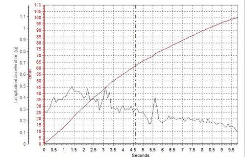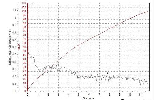 軒逸的0-100km/h加速時間為10.90秒,另外我們從加速曲線圖中也能看到,軒逸的加速力度異常平順
