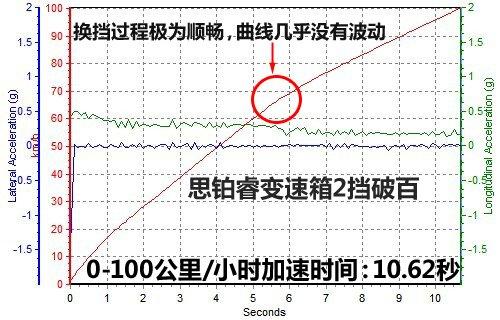 既然說到這里,就讓我們先來看看思鉑睿的加速成績。如果你用S擋自動模式(關(guān)掉車身穩(wěn)定控制),起步的時候根本聽不到輪胎有一絲接近極限的跡象,看著發(fā)動機(jī)轉(zhuǎn)速慢慢攀升的樣子讓人覺得時間十分漫長,最終的成績都將會在11秒開外,這顯然不能代表思鉑睿的真實(shí)水平。后來測試中我們在S擋下改用手動模式,盡管思鉑睿的5擋變速箱可以2擋破百,也就是說在測試過程中只需要換一次擋,但區(qū)別還是很大。在S擋模式下,發(fā)動機(jī)轉(zhuǎn)速會在不到6500轉(zhuǎn)/分鐘的時候自動換擋,而手動模式可以把轉(zhuǎn)速拉到7000轉(zhuǎn),這樣一來在換到2擋時就可以獲得更高的轉(zhuǎn)速,加速成績可以提高將近一秒鐘左右。最終我們實(shí)測的思鉑睿0-100加速成績?yōu)椋?0.62秒。