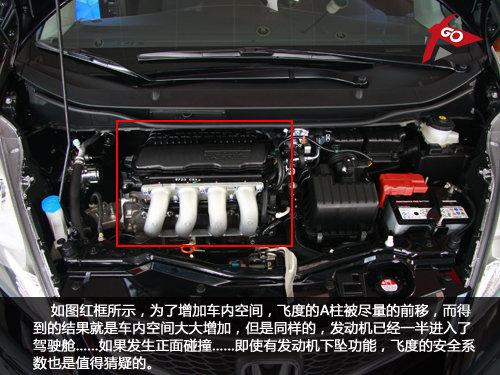 就像前邊說(shuō)到的飛度短促的車頭,當(dāng)你打開(kāi)發(fā)動(dòng)機(jī)蓋子的時(shí)候,你會(huì)發(fā)現(xiàn)飛度的發(fā)動(dòng)機(jī)的位置已經(jīng)一半進(jìn)入了駕駛艙,就算有發(fā)動(dòng)機(jī)下墜功能,但是編輯我還是懷疑它的安全系統(tǒng)的能力。