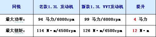 同悅?cè)碌陌l(fā)動(dòng)機(jī)除了增加VVT技術(shù)外,在排量上也比老款發(fā)動(dòng)機(jī)有了一定的提升,其氣缸容積達(dá)到1332cc,超過了老款車型1299cc。新款發(fā)動(dòng)機(jī)的最大功率達(dá)到99馬力,最大扭矩為126牛米/4500rpm。最大功率比老款大了5馬力,最大扭矩更是增加了12牛米。