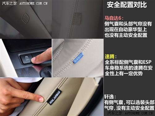 對比配置,我們先從安全性配置開始,在這方面,無疑速騰是最大的贏家,因為馬自達6除了最基本的ABS+EBD和雙氣囊之外,沒有別的更多安全配置;而速騰是全系標配ESP和側(cè)氣囊的;軒逸盡管主動安全配置沒什么亮點,但這款高配車型有側(cè)氣囊,而且可以選裝頭部氣簾,所以還是比馬自達6更勝一籌。