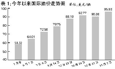 國內(nèi)油價上漲最直接的因素就是國際油價的大幅攀升。上周國際市場原油價格連創(chuàng)歷史新高,達(dá)到了94美元/桶。而在此前,紐約WTI原油期貨價格2007年年初價格為58.32美元/桶,3月份以后國際市場原油價格開始上漲,特別是近兩個月加速上升,9月14日和10月29日分別突破了每桶80美元和90美元。11月2日紐約原油期貨價格大幅上揚(yáng),比前一個交易日上漲2.44美元,終盤再創(chuàng)新高,收于每桶95.93美元。這個價格比起今年年初上漲了近40美元,漲幅超過80%。此間,國際油價雖然出現(xiàn)過小幅回落,但高位震蕩的格局一直難以改觀,甚至有愈演愈烈之勢。