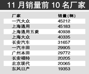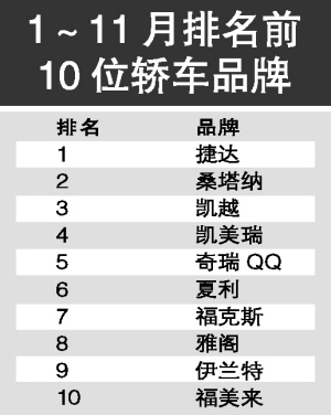 1~11月,自主品牌轎車(chē)共銷(xiāo)售113.61萬(wàn)輛,占轎車(chē)銷(xiāo)售總量27%,前10大品牌共銷(xiāo)售82.78萬(wàn)輛,占自主品牌轎車(chē)銷(xiāo)量的73%。自今年10月以來(lái),自主品牌就實(shí)現(xiàn)百萬(wàn)輛銷(xiāo)售成績(jī)的突破,盡管如此,自主品牌還是不敵日資企業(yè)上升趨勢(shì)強(qiáng)勁。