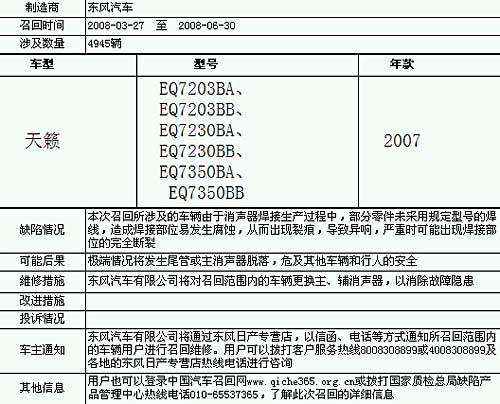消聲器存在隱患 東風日產(chǎn)召回4945輛天籟轎車