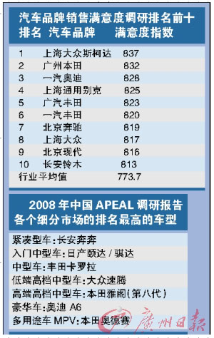 無獨有偶,由國務院國資委研究中心、中國汽車工業(yè)協會、中國質量協會、中國環(huán)保協會等權威機構創(chuàng)立的獨立第三方調研活動——“2008中國汽車品牌銷售滿意度調查”結果出爐,2008年汽車銷售行業(yè)滿意度指數平均分值773.7,較上年提升了5分。但與2007年相比,本土品牌的銷售滿意度大幅下降5.7%。
