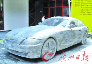 據(jù)介紹,該作品由現(xiàn)代藝術家戴耘歷時一年多創(chuàng)作完成。記者發(fā)現(xiàn),其輪胎、方向盤、排氣管,甚至連車標都是用磚頭精心打磨而成。該創(chuàng)意園的工作人員介紹,這部車除了不能開之外,外形酷似寶馬車,價值達70多萬元,其價位也堪比真寶馬。(鮑文娟)