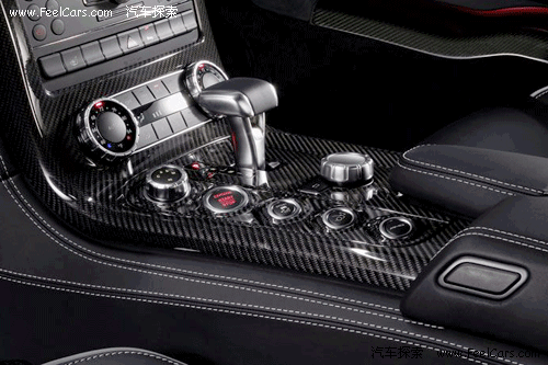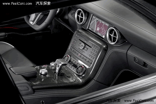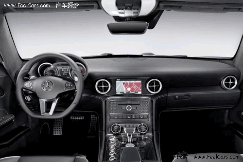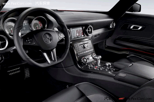 看到內(nèi)飾的第一感覺就是運(yùn)動感很強(qiáng),無論是全黑色的真皮內(nèi)飾,還有鑲嵌點(diǎn)綴在各處的碳纖維面板,或者是三輻、平底的真皮方向盤,像瞄準(zhǔn)鏡一般的空調(diào)出風(fēng)口等等,都毫不客氣的顯露出了SLS以運(yùn)動為本的設(shè)計(jì)理念,當(dāng)然,這也是在向前輩300SL致敬。