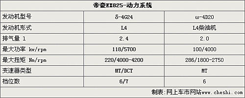 在動(dòng)力方面,帝豪EX825將搭載兩款發(fā)動(dòng)機(jī),其中一款為2.4L排量的汽油發(fā)動(dòng)機(jī),最大功率可達(dá)118千瓦,而且在4000轉(zhuǎn)的時(shí)候即可迸發(fā)出220牛.米的扭矩。這款車型可以匹配六速手動(dòng)變速箱,還可以配備吉利研發(fā)的7速雙離合變速器。另外,這款車還搭載了2.0L柴油發(fā)動(dòng)機(jī),在4000轉(zhuǎn)的時(shí)候就可以達(dá)到100千瓦的最大功率,1800轉(zhuǎn)的時(shí)候的扭矩就可以達(dá)到286牛.米,低轉(zhuǎn)速的動(dòng)力表現(xiàn)著實(shí)不錯(cuò)。