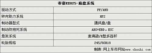 帝豪EX825不僅配備了ABS和EBD主動(dòng)安全系統(tǒng),還帶有博世公司開(kāi)發(fā)的ESC電子穩(wěn)定系統(tǒng),保證整車可以擁有更出色的安全性。這款車采用多連桿后獨(dú)立懸掛,配備245/60R18的寬大輪胎,使整車的運(yùn)動(dòng)性能也并不遜色。
