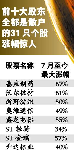 權(quán)威統(tǒng)計數(shù)據(jù)顯示,能夠在A股上市公司前十大流通股股東中“露臉”的個人投資者超過5000人。從中報來看,31只股票的前十大股東都是個人投資者,并且在7月份以來其整體表現(xiàn)十分出色,漲幅超過20%的就達(dá)22只。