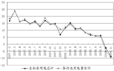 由國(guó)網(wǎng)北京經(jīng)濟(jì)技術(shù)研究院副院長(zhǎng)胡兆光博士繪制的一份“2007年以來(lái)各月我國(guó)全國(guó)及各行業(yè)用電量增長(zhǎng)速度”圖表(圖1)顯示:全國(guó)月度用電量增長(zhǎng)率在2007年3月曾高達(dá)23.88%,全行業(yè)(一、二、三產(chǎn))月度用電量增長(zhǎng)率也達(dá)到23.48%。此后便呈起伏式下滑,全國(guó)用電量10月份同比增長(zhǎng)-2.18%,11月份同比增長(zhǎng)-8.33%。