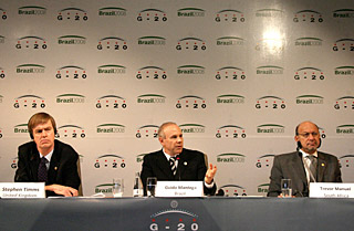 二十國集團(tuán)財政部長和中央銀行行長(G20)2008年年會9日在巴西圣保羅閉幕,與會代表一致認(rèn)為有必要改革目前的國際金融體系,采取共同行動應(yīng)對全球金融危機(jī)。
