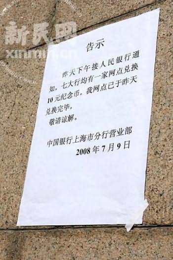 據(jù)悉,在昨天部分銀行網(wǎng)點開放兌換奧運(yùn)紀(jì)念鈔后,今天是滬上各大銀行集中兌換的日子。市民都是得知這一消息后趕來的,其中更有人在昨晚看了新聞后便趕到銀行門口候了一晚。但今天上午7點多,銀行工作人員忽然在門口貼出告示,表示該支行的配額已經(jīng)在之前兌換完畢,讓排隊市民去別家支行兌換。