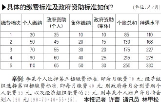 最低的個(gè)人繳費(fèi)標(biāo)準(zhǔn)確定為30元,以20元為級差,向上設(shè)立五個(gè)檔次的繳費(fèi)標(biāo)準(zhǔn),最高一檔為110元。參保農(nóng)民可根據(jù)各自的經(jīng)濟(jì)承受能力自愿選擇一檔繳費(fèi),多繳多得。《辦法》對經(jīng)濟(jì)組織設(shè)計(jì)了5個(gè)檔次的繳費(fèi)標(biāo)準(zhǔn),從10元至50元不等;對于確無經(jīng)濟(jì)能力的經(jīng)濟(jì)組織,也可以暫不為參保人繳費(fèi)。
