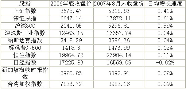 表1 1990年12月末~2006年12月末主要股指平均月增長率
