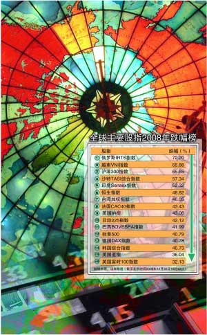 發(fā)達(dá)經(jīng)濟(jì)體如此,以往一直以“免疫力”強(qiáng)著稱的新興市場也未能幸免。其中,受到油價(jià)下跌和金融危機(jī)雙重打擊的俄羅斯股市全年跌幅超過70%,高居全球之首!敖鸫u四國”中的另外三國——中國、印度和巴西,股市全年跌幅都超過40%甚至高達(dá)60%。