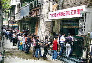 昨天,倉邊路的廣州市公民刑事記錄證明辦理處依然大擺長龍,排隊(duì)辦證的參展人員臉上寫滿了焦慮、擔(dān)憂、茫然。有工作人員透露,這兩天的“盛況”前所未有。