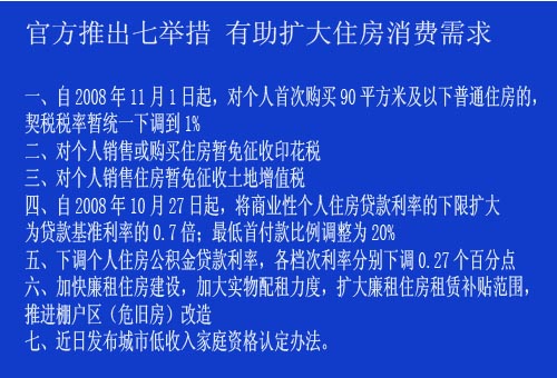 從2008年11月1日起,對個人首次購買90平方米及以下普通住房的,契稅稅率暫統(tǒng)一下調(diào)到1%;對個人銷售或購買住房暫免征收印花稅;對個人銷售住房暫免征收土地增值稅。地方政府可制定鼓勵住房消費的收費減免政策。[詳細內(nèi)容]