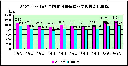 今年1-10月份,全國住宿與餐飲業(yè)零售額累計實現(xiàn)10030.6億元,同比增長18.6%,比去年同期增幅高出2.4個百分點,占社會消費品零售總額的13.9%,拉動社會消費品零售總額增長2.5個百分點,對社會消費品零售總額的增長貢獻率為15.7%。