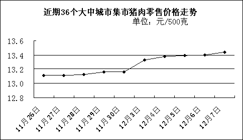 中新網(wǎng)12月10日電 國家發(fā)改委網(wǎng)站消息稱,據(jù)國家發(fā)展改革委價(jià)格監(jiān)測(cè)中心監(jiān)測(cè),上周(12.3-12.7,下同)全國36個(gè)大中城市集市豬肉(精瘦肉)平均零售價(jià)格每500克為13.39元,比上期(11.26-11.30,下同)上漲1.98%。