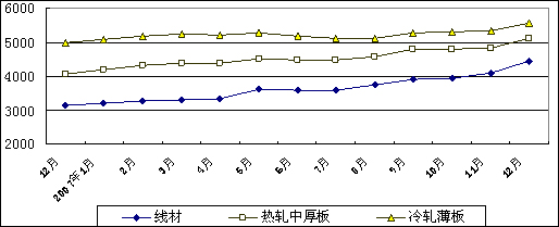鋼材價格漲幅較大。12月份,線材(普線6.5,Q235)、熱軋中厚板(6,Q235)、冷軋薄板(1,Q235)全國平均價格分別為4459元/噸、5097元/噸、5560元/噸,與上月相比分別上漲9.24%、5.64%、4.39%。