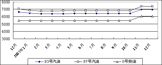 12月份,成品油供應緊張局面有所緩解,市場價格保持基本平穩(wěn)。36個大中城市加油站90號、93號、97號汽油和0號柴油實際零售價格分別為每噸6569元、6985元、7384和6039元,均與上月基本持平。