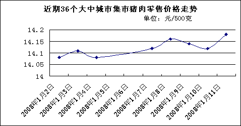 中新網1月14日電 國家發(fā)改委網站消息稱,據國家發(fā)展改革委價格監(jiān)測中心監(jiān)測,上周(2008.1.7-2008.1.11,下同)全國36個大中城市集市豬肉(精瘦肉)平均零售價格每500克為14.14元,比前一周(2007.12.31-2008.1.4,下同)上漲0.35%。