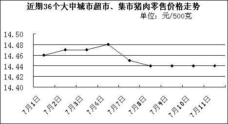 中新網(wǎng)7月14日電 國家發(fā)改委網(wǎng)站消息稱,據(jù)國家發(fā)展改革委價(jià)格監(jiān)測中心監(jiān)測,上周(7月7日-7月11日)全國36個(gè)大中城市集市、超市豬肉(精瘦肉)平均零售價(jià)格每500克為14.44元,比前一周(6月30日-7月4日,下同)下降0.21%。