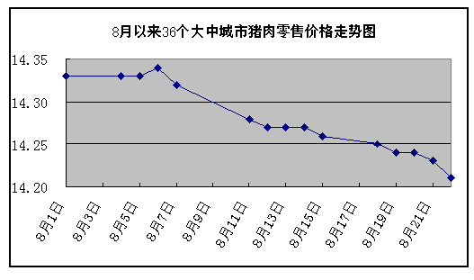 中新網(wǎng)8月25日電 國家發(fā)改委網(wǎng)站消息,據(jù)國家發(fā)改委價(jià)格監(jiān)測中心監(jiān)測,上周(8月18日~8月22日)全國36個(gè)大中城市集市、超市豬肉(精瘦肉)平均零售價(jià)格每500克為14.23元,與前一周(8月11日~8月15日,下同)相比下降0.28%。