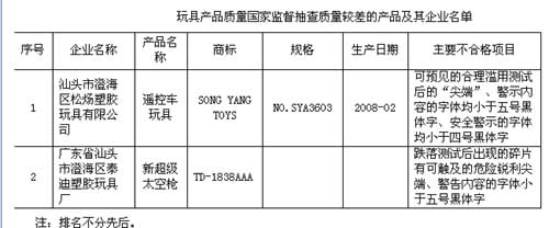 中新網(wǎng)5月31日電 據(jù)國(guó)家質(zhì)檢總局網(wǎng)站消息,國(guó)家質(zhì)檢總局組織對(duì)玩具產(chǎn)品質(zhì)量進(jìn)行了國(guó)家監(jiān)督抽查,共抽查了北京、上海、江蘇、浙江、廣東、福建、山東等7個(gè)省、直轄市176家企業(yè)生產(chǎn)的182種產(chǎn)品(不涉及出口產(chǎn)品),產(chǎn)品實(shí)物質(zhì)量抽樣合格率為99.4%。