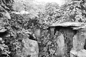 在“稱巖松”石刻背后不遠,更深地“隱藏”著一塊四周雕有花紋的石匾,從資料分析,這當是當年流落至此的另一重要文物——澤蘭堂乾隆御筆“熙春洞”,但刻字卻已模糊到幾乎湮滅無蹤的地步。