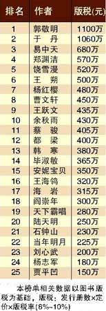 中新網(wǎng)11月6日電 今天,《成都商報》聯(lián)合某排行網(wǎng)站發(fā)布了一份名為“2007年中國作家富豪榜”的榜單,在這份榜單中,80后作家郭敬明以收入1100萬登頂,借電視屏幕迅速走紅的學術超女超男于丹、易中天緊隨其后,以天下霸唱為代表的網(wǎng)絡寫手也成功躋身富豪榜。