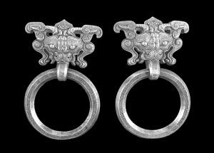這對門環(huán)為純銀澆鑄,是清朝乾隆時期皇家造辦處專為圓明園中的建筑特制的門環(huán),樣子仿西周的饕餮銅環(huán),不同于當時常見的獅首或古釘狀式樣,十分罕見。