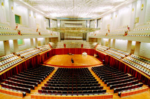 在公共空間的另一側(cè),是設(shè)計(jì)獨(dú)特的戲劇場。戲劇場共計(jì)有1035個(gè)席位,具有濃郁民族色彩的絲布墻面體現(xiàn)出戲劇場親切、熱烈而傳統(tǒng)的氣氛,平時(shí)主要以戲曲、話劇演出為主。劇場內(nèi)設(shè)置的“鼓筒式”轉(zhuǎn)臺是根據(jù)德累斯頓歌劇院和英國皇家芭蕾舞劇院的舞臺組合出的新型轉(zhuǎn)臺,可以達(dá)到15塊臺邊移動、邊升降、邊旋轉(zhuǎn)的舞臺效果———演出話劇《江姐》的時(shí)候,只消升起兩塊臺板構(gòu)成一個(gè)立體矩形,前邊再放上一只火盆,就構(gòu)造出渣滓洞監(jiān)獄的陰森場景;如果把這些臺板漸次升起,就是可供合唱團(tuán)站立的標(biāo)準(zhǔn)性臺階;如果把臺板按需要升起后再進(jìn)行圓臺旋轉(zhuǎn),那么戲劇導(dǎo)演可以在數(shù)個(gè)舞臺場景瞬間切換。