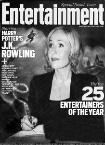 《娛樂周刊》按照一個班級里可能會出現(xiàn)的5種人來為娛樂界的名人定位,他們分別是天賦異稟、班中小丑、風云達人、八卦之星和致詞代表。今年推出《哈利.波特》完結篇的羅琳沒被歸于其中任何一類,被選為“年度娛樂人物”。雜志認為,羅琳完成了不可能完成的任務,在電玩和在線游戲充斥、一切講究短小輕薄的年代,她施展魔法,讓數(shù)億大小孩抱著厚厚的印刷書籍愛不釋手,雜志如此評價說:“《哈利.波特》已賣出了4億冊,并且拍成了有史以來最賺錢的電影系列片,羅琳讓人們圍著她老式的印刷大書團團轉,好像這就是地球上最火熱的新娛樂手段似的!