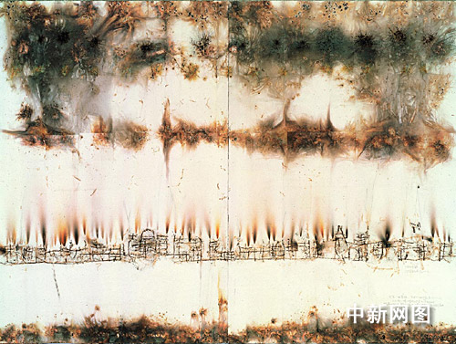 2001年10月,蔡國強(qiáng)為當(dāng)時在上海舉行的“亞太經(jīng)合組織會議”(APEC),動用了超過26,000 枚煙花火藥,上演了長達(dá)20分鐘的煙火爆破,獲得國內(nèi)外的高度贊揚。本次拍賣推出的《APEC景觀焰火表演十四幅草圖》,正是他在上海APEC爆破后,在宣紙上以爆破方法再現(xiàn)當(dāng)晚景況而創(chuàng)作的十四幅草圖。