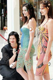 昨日,Ambah早上8時(shí)便開(kāi)始在兩名外籍模特兒身上畫(huà)彩繪,在助手的協(xié)助下,模特兒在下午1時(shí)便化身成亮麗的孔雀和蝴蝶。她說(shuō),最少要用4小時(shí),若要將每一部分都細(xì)致地繪畫(huà)出來(lái),便可能要畫(huà)上一整天。由于模特兒需要休息和洗澡,所以每幅作品通常只能保持一天,但她并不覺(jué)得太可惜,反而這種一瞬間的美麗,更能給吸引她去創(chuàng)作。