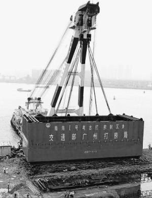 有關(guān)方面預(yù)計(jì),整個(gè)工程處理和撈起的泥沙、瓷器及各種文物將超過5000噸。為了保證將“南海Ⅰ號(hào)”成功吊起,交通部廣州打撈局在“華天龍”起吊的同時(shí),計(jì)劃安排一艘全潛駁船及時(shí)插入“南海Ⅰ號(hào)”底部將其托住,并承載整體平移,讓打撈萬無一失。
