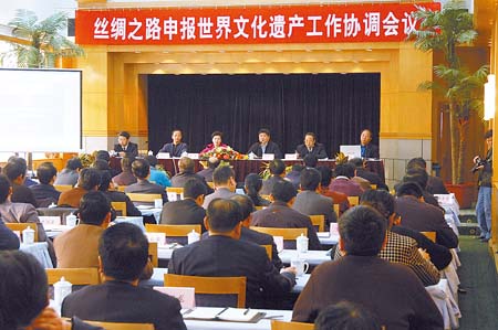 12月28日上午9時,絲綢之路申報世界文化遺產(chǎn)工作協(xié)調(diào)會議在蘭州飯店8樓會議室召開,國家文物局局長單霽翔、甘肅省副省長咸輝、國家文物局文物保護司司長顧玉才及79名相關(guān)省區(qū)代表參加了當天的會議。會上,單霽翔向與會代表強調(diào)了絲路申遺的重大意義,并指出了全國48個申遺點存在的問題和不足。