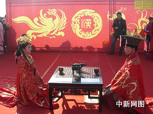 2008新年伊始,浙江省臺州市一行人身著漢服在莊重而又喜慶的古樂伴奏下,昂首闊步向市中心廣場走去。經(jīng)了解得知,這是臺州市首次舉辦的傳統(tǒng)漢民族婚禮展示;顒佑蓚鹘y(tǒng)漢民族婚禮表演、漢民族婚服展示、傳統(tǒng)漢婚有獎知識問答三部分組成。