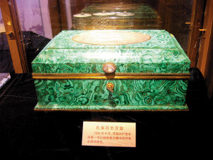 1954年9月,蘇聯(lián)共產(chǎn)黨中央第一書(shū)記赫魯曉夫贈(zèng)送毛澤東的孔雀石首飾盒。