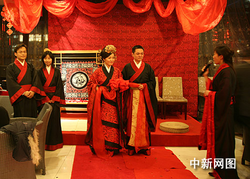 據(jù)新人說,穿上自己民族的禮服——漢服,為自己舉辦一場漢民族傳統(tǒng)婚禮,在越來越多代表民族傳統(tǒng)的東西被重新表達(dá)的今天,是件十分有意義的事。莊重、質(zhì)樸的周制婚禮儀式上的神圣,對“孝敬父母”、“夫婦之義”、“人倫之本”等民族精神內(nèi)涵的深刻闡述,都是時下泛濫的西式婚禮所遠(yuǎn)遠(yuǎn)不能與之相比的。
