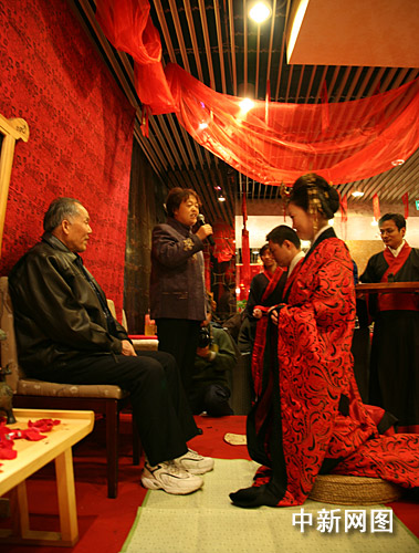 中新網(wǎng)1月20日電 1月19日晚,北京一對新人舉行了一場莊重典雅的漢民族傳統(tǒng)婚禮——周制婚禮,新人服飾、現(xiàn)場布置和儀程設(shè)計,均以自周流傳至秦、漢的婚俗為依托。