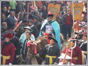為了迎接身穿清朝官服、嘴角邊耷拉著兩撇長(zhǎng)胡須、帶著圓餅狀墨鏡的主角——“牛老爺”,村民們?cè)缭缇兔钇饋。這次耍社火,主角“牛老爺”可是從全村人中按照德貌雙全的標(biāo)準(zhǔn)篩選出來的!芭@蠣敗贝┭ゴ髅睊旃俜b扮成清朝官員,還騎頭大黃牛,煞是威風(fēng)。