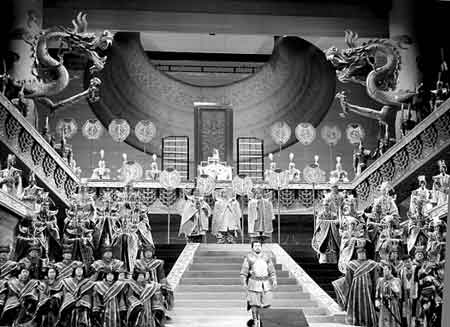 第二幕的宮廷場(chǎng)景也會(huì)給觀眾“驚艷”的感覺(jué)。第二幕的第一場(chǎng)是三個(gè)活寶大臣平、龐、朋追憶似水年華的“過(guò)場(chǎng)戲”,這一場(chǎng)的布景和燈光都比較低調(diào);而第二場(chǎng)的猜謎情節(jié)是歌劇劇情的一大高潮,當(dāng)燈光驟然打亮,一個(gè)高入云端、金碧輝煌的宮殿赫然出現(xiàn)在眼前的時(shí)候,連該劇的主創(chuàng)人員自己都被“震”了。為普契尼續(xù)寫歌劇最后18分鐘的中國(guó)作曲家郝維亞說(shuō),在國(guó)外看過(guò)不下10個(gè)版本的圖蘭朵,但這一場(chǎng)宮廷猜謎的舞臺(tái)效果“太讓人吃驚了”!