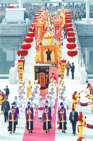 陜西省清明公祭軒轅黃帝典禮籌備工作委員會近日發(fā)出公告,向全球首次征集戊子(2008)年清明公祭軒轅黃帝祭文,并公開表示,今年的戊子年清明公祭軒轅黃帝典禮將于4月4日上午9:50在黃陵縣橋山軒轅殿廣場隆重舉行。公祭典禮舉行當(dāng)天,軒轅廟前將以彩旗、龍旗裝扮,軒轅橋至軒轅殿通鋪地毯。軒轅橋欄將安置34個大紅燈籠,登陵神道,主要街道,軒轅大道,橋山廣場等地方將用空飄彩球,龍旗,宮燈,花燈等進(jìn)行裝扮烘托,營造隆重氣氛。