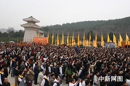中新網(wǎng)黃陵4月4日電 (朱鵬英)2008年4月4日上午9時50分,戊子年清明公祭軒轅黃帝典禮在陜西黃陵縣橋山正式開始,來自海內外的八千多名中華兒女聚集在黃帝陵前,共同祭拜中華民族的"人文始祖"軒轅黃帝,緬懷共同的先祖。