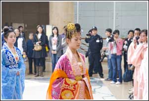 為了讓現(xiàn)代人感受傳統(tǒng)節(jié)日的文化內(nèi)涵,昨天上午9點(diǎn),30余位愛好漢服文化的網(wǎng)友相聚在西安博物院,他們身著傳統(tǒng)漢服,現(xiàn)場(chǎng)演示古代女子的成人禮——笄禮。昨天的笄禮儀式十分莊重,因?yàn)榧磳⑿畜嵌Y的女子是一位唐朝“公主”!肮鳌彼┓b為唐代皇室貴族的佃釵大禮衣系列,高雅華貴。